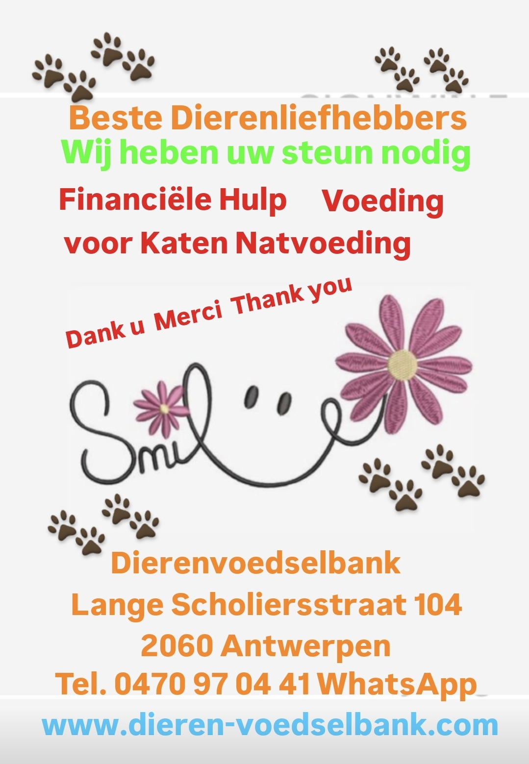 We willen een actie opzetten voor kattenvoer en honden en knaagdieren voer en vlees en benodigdheden wat ze allemaal nodig zijn wil u wat brengen of financiële ondersteuning willen doen elke maand kleine bijdrage altijd welkom of eenmalig wat u wil of blikken of flessen voor onze dieren wat we doen we helpen mensen die in minima hulp zitten en hun dieren wel willen behouden en toch nog eten krijgen dan van ons als ondersteuning punt voor de gezinnen elke maand kunnen ze dan pakket ophalen daarom hebben we ook aardig wat voer en vlees en benodigdheden nodig wat u kan doen is u mag brengen we zitten in de